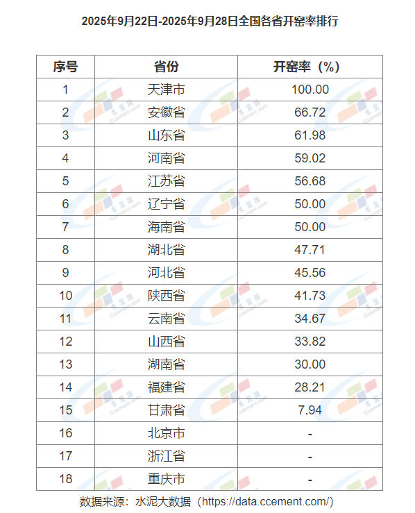 2025年9月22日-2025年9月28日全國各省開窯率排行